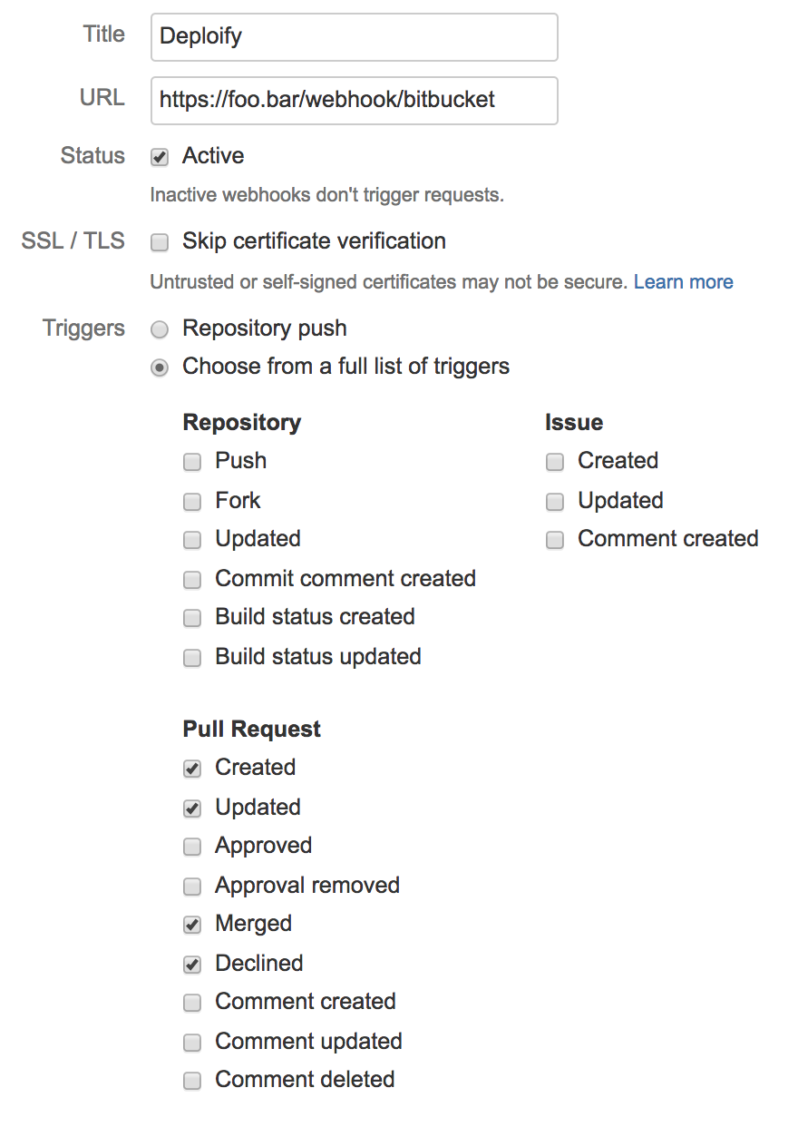 Go to your repository page, then follow Settings -> Workflow -> Webhooks -> Add webhook. Create a webhook choosing from the list of triggers the following events of the Pull Request: Created, Updated, Merged and Declined.