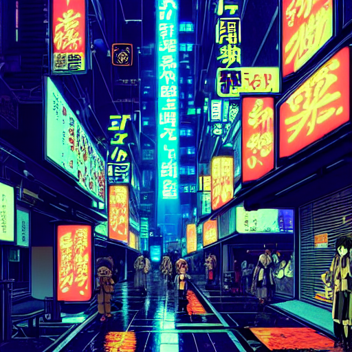 stability \ -s 150 \ # Steps -c 15 \ # Cfg Scale -a k_euler_ancestral \ # Diffusion Method -S 3465383516 \ # Seed -o ./examples \ # Output Directory -n 5 \ # 5 images "a anime still of an highly detailed night cyberpunk city life, bladerunner style!! detailed shops, neon lights, ray tracing, advertising everywhere, people and robots walking around. art by satoshi kon and studio ghibli, in the style of ghost in the shell, muted colours, hyperrealism, cinematic lighting, lush detail, award winning, wlop, octane render, trending on artstation"