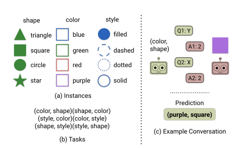 Answerer has an image attributes, as shown in figure. Questioner cannot see the image, and has a task of finding two attributes of the image (color, shape, style). Answerer does not know the task. Multiple rounds of q/a dialogs occur, after which the questioner has to guess the attributes. Reward to both bots is given on basis of prediction of questioner.