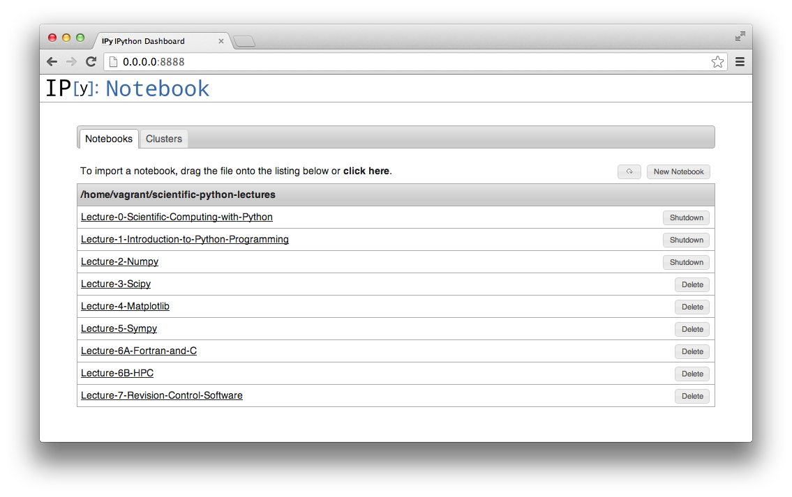 $ cd Eidyia $ vagrant up $ vagrant ssh $ python3 Python 3.3.1 (default, Apr 17 2013, 22:30:32) [GCC 4.7.3] on linux Type "help", "copyright", "credits" or "license" for more information. >>> import numpy as np >>> import matplotlib.pyplot as plt >>>