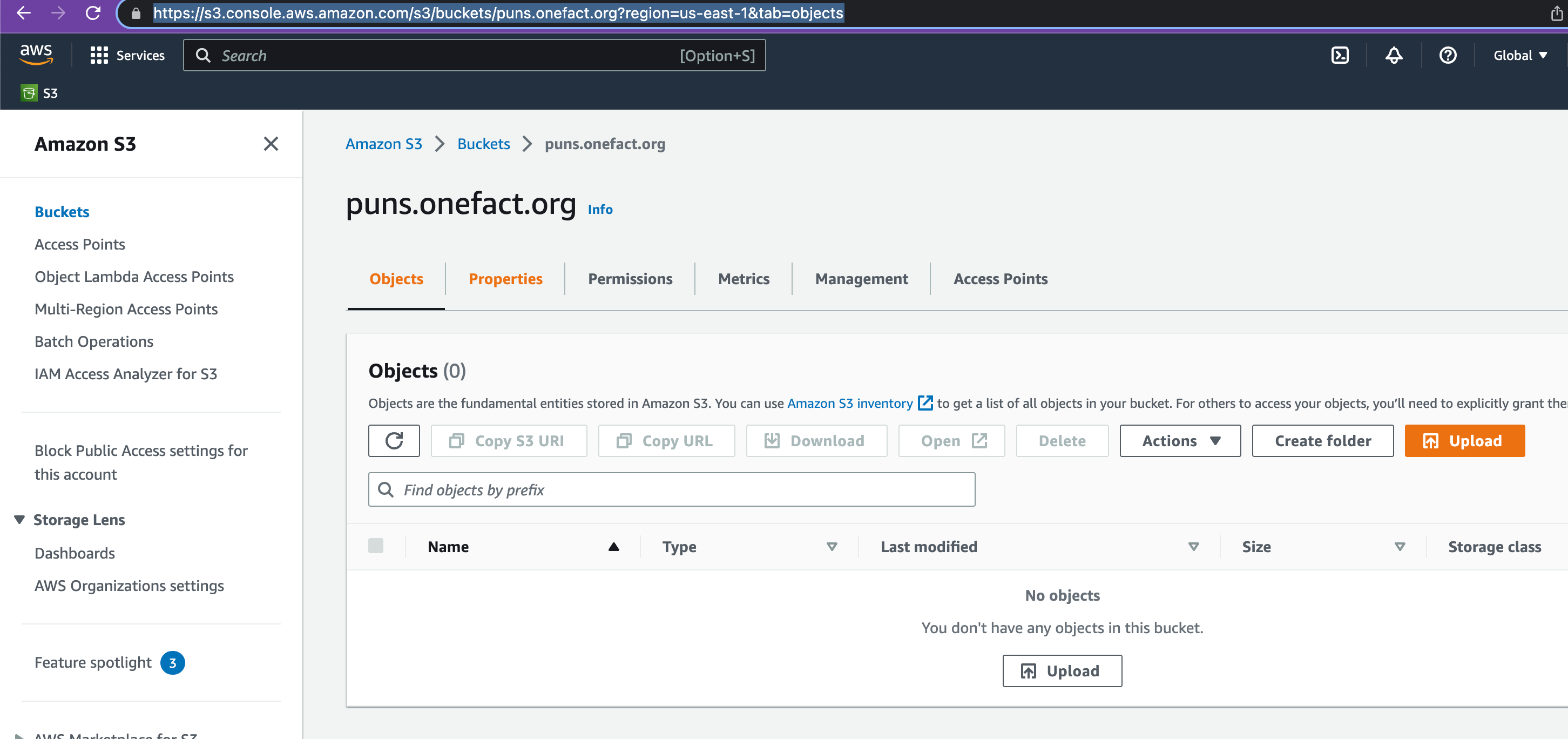 - in the bucket page, for example at https://s3.console.aws.amazon.com/s3/buckets/puns.onefact.org?region=us-east-1&tab=objects, click on "Properties"