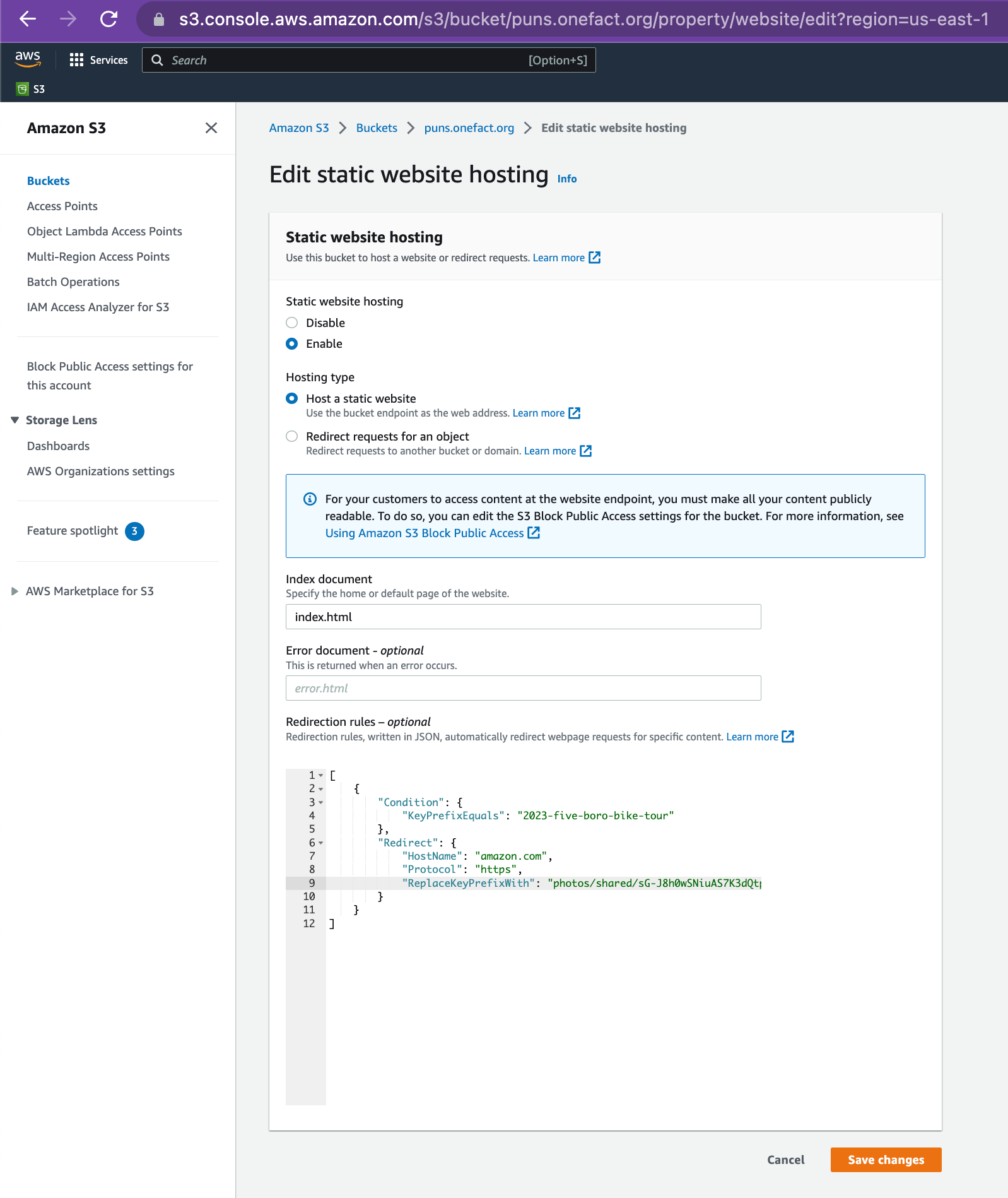 - copy and paste one of the below sets of JSON redirects -- this is where the magic happens and you get to make "subdomain.customdomain.com/myshorterlink" redirect to a long link! on this page: https://s3.console.aws.amazon.com/s3/bucket/puns.onefact.org/property/website/edit?region=us-east-1
