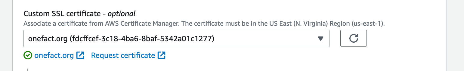 - [one time] issue an SSL certificate for the domain (e.g. https://onefact.org) in Cloudfront
