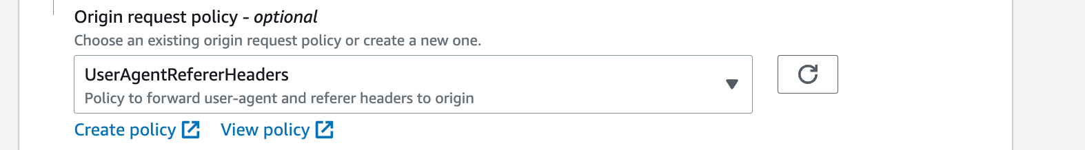 (c) Select "User and agent referrer headers" under `Cache key and origin requests `: (d) Enter the custom domain name under "CNAME", such as `photos.onefact.org`:(e) Enter index.html for under the Default root object property: