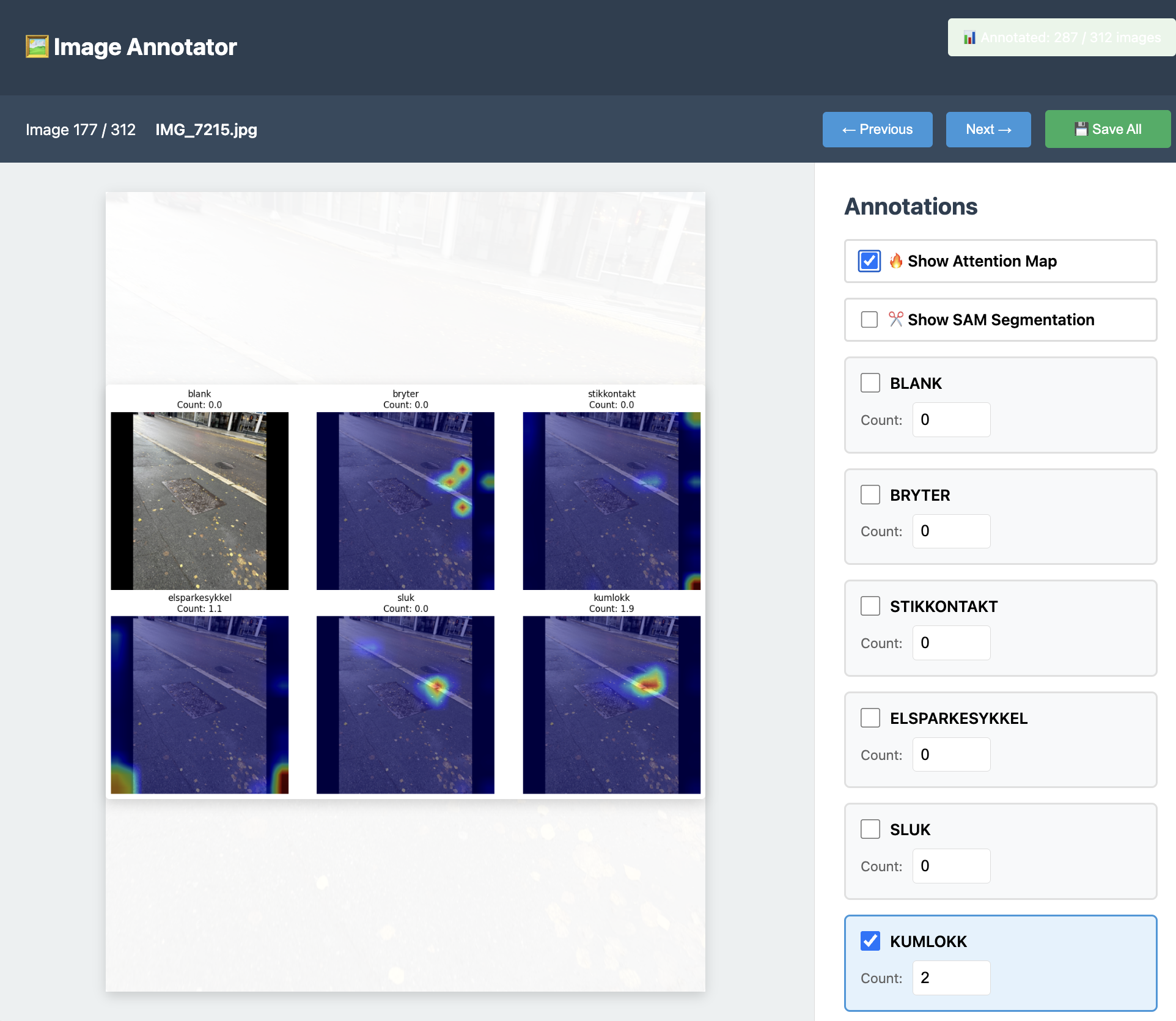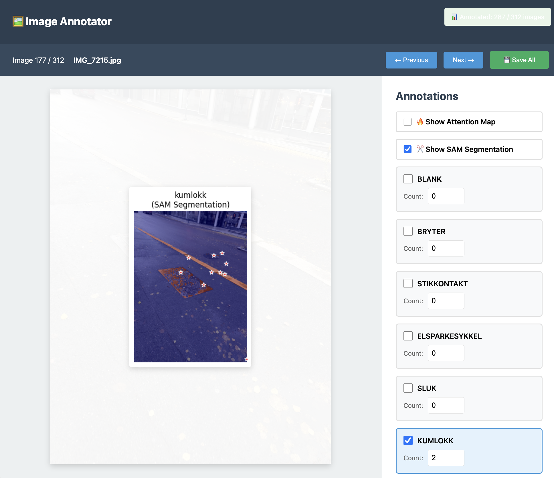 โorP: Previous imageโorN: Next imageCtrl+S: Save all annotationsSpaceor0: Toggle "blank" classB: Toggle "bryter" (switch)K: Toggle "stikkontakt" (outlet)E: Toggle "elsparkesykkel" (e-scooter)S: Toggle "sluk" (drain)M: Toggle "kumlokk" (manhole cover)1-9: Set count for active class