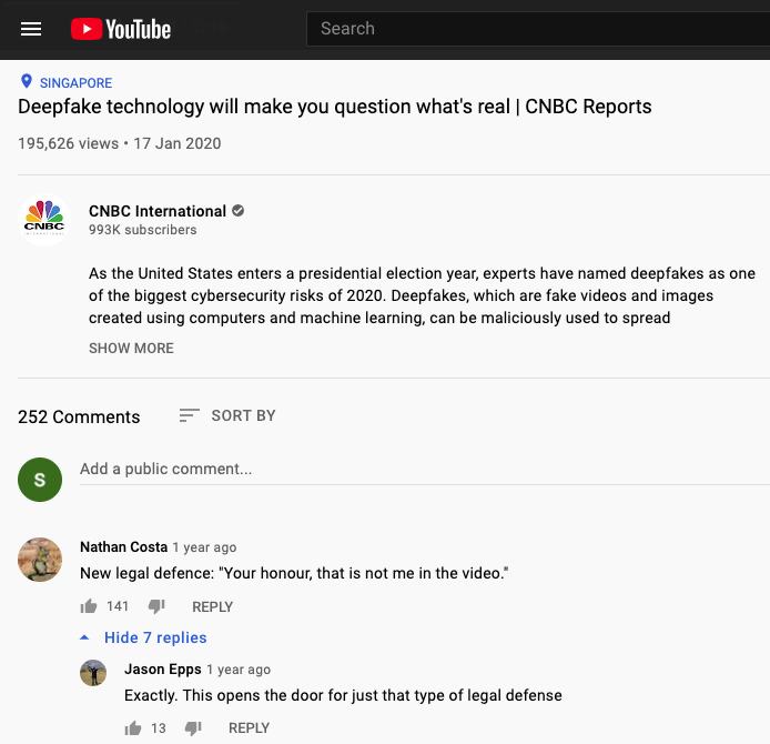 Advancements in Deep Learning have made it possible for lay-persons to create photo-realistic computer generated images (CGI) cheaply. Such CGIs are called "DeepFakes". DeepFakes can be used to spread malicious lies and a lot of attention has been posed to the direct risk posed by deepfakes. However, deepfakes create an even bigger, indirect problem, that malicious actors can discredit genuinely real images by claiming that they are deepfakes. Similar concerns were raised in a recent report about an alleged deepfake of a teenager link. This potential for abuse is readily apparent to even a casual observer, as evident from the youtube screenshot below. So, my motivation is to prove that a real image is not a fake.