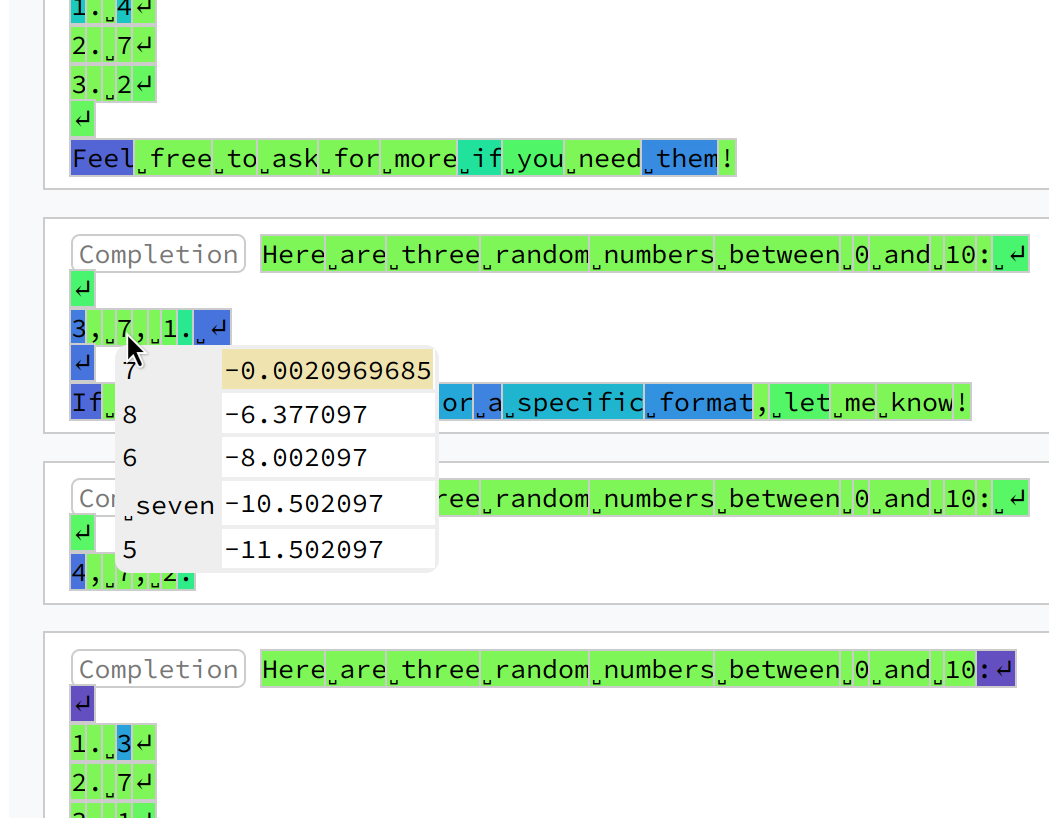 A common usage is to tick the "logprobs" checkbox and enter a number of 1 to 20 in "top_logprobs". Enter your prompt and click "Complete". The log probabilities will be displayed below. Mouse over the tokens to see the log probabilities of candidates. Enable "stream" to see result in real-time.