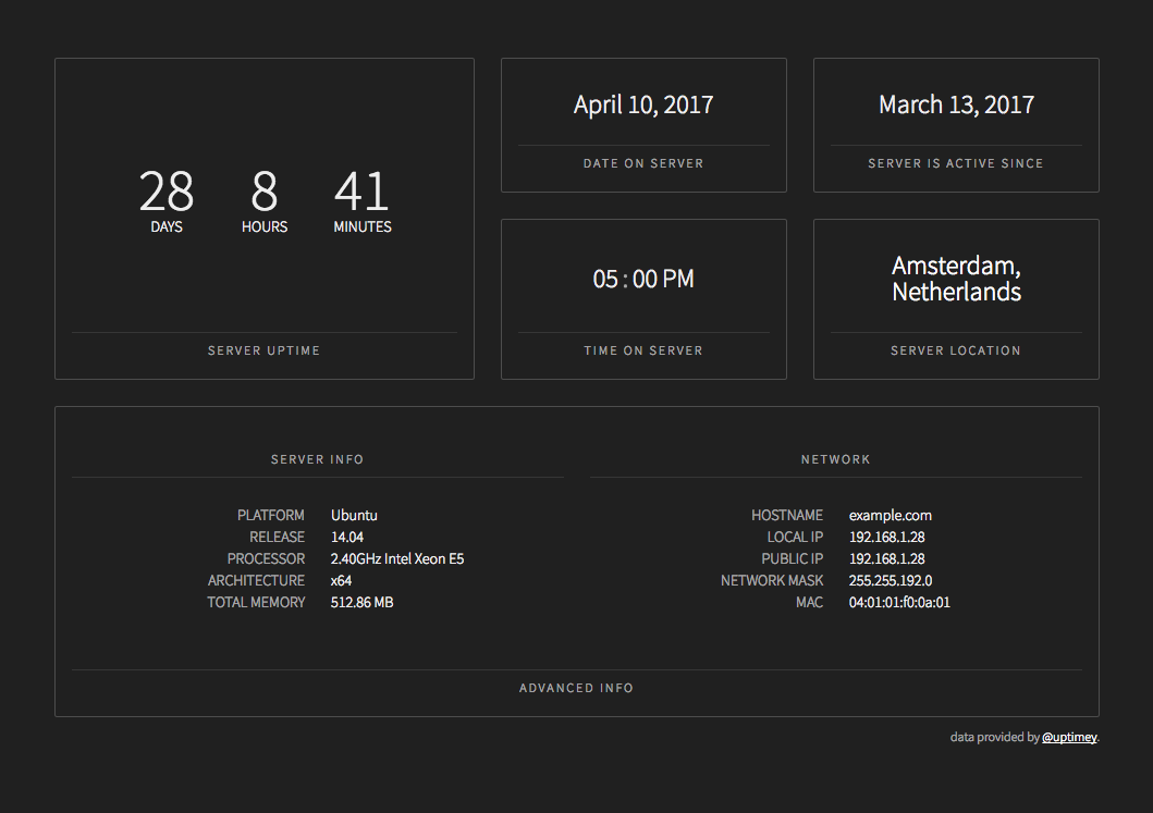 With uptimey you can easily monitor your server's uptime. It will output usefull data that you might need during your day, while you intereact with your server. Don't believe me, check out the screenshot bellow.