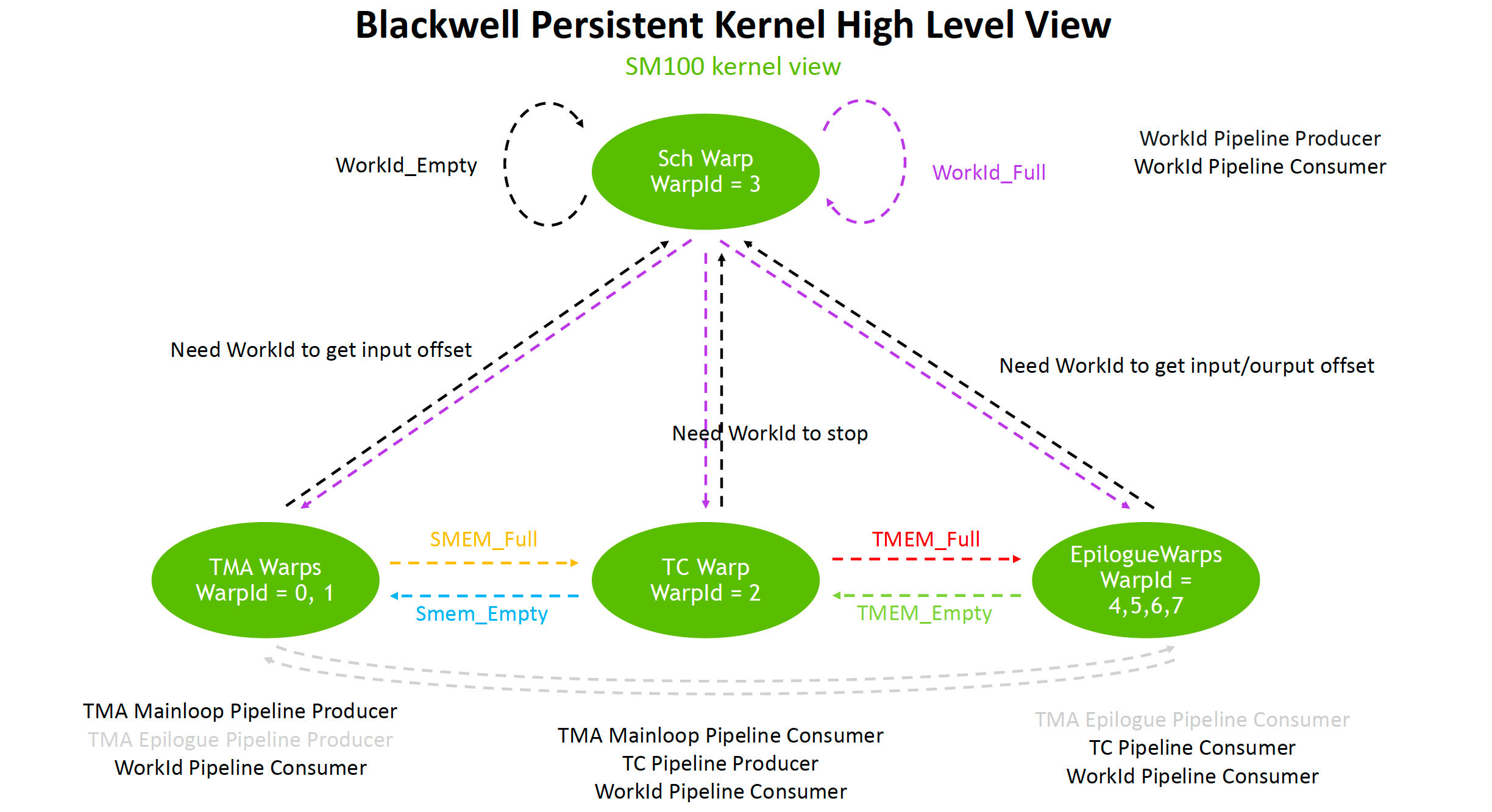 In fact, from a management complexity perspective, the Sch warp, TMA warp, and TC warp in the diagram below can all be handled at the single-thread level. Only the EpilogueWarp needs the old SIMT-style approach. Once you understand this, it doesn't seem that complicated.