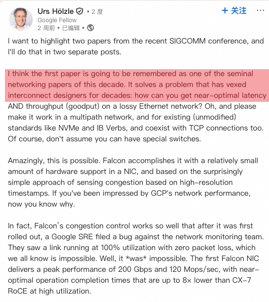 When the world's collective understanding is at a certain point, many things that are too far ahead will end up like Giordano Bruno, burned at the stake... For example, to change the topic, RDMA's Lossy vs. Lossless... when the whole world is on Lossless, being too far ahead can also cause problems. It's only now that you have to consider scaling across... Look at what a Google Fellow says; he said Falcon is a very important paper from the last decade.