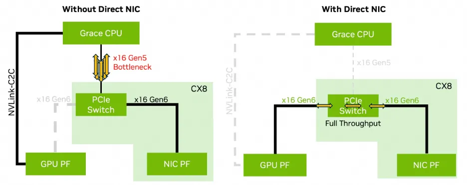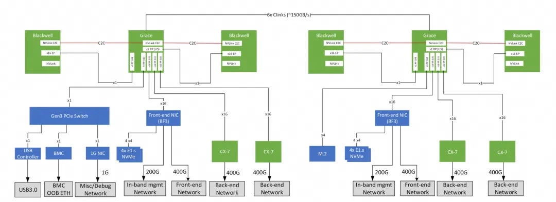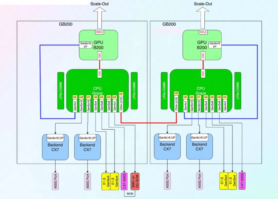 Furthermore, with the GB200, the paired CX7 does not have a built-in PCIe Switch, so ScaleOut RDMA traffic will traverse the entire Grace NOC and then pass through NVLink C2C to reach Blackwell.