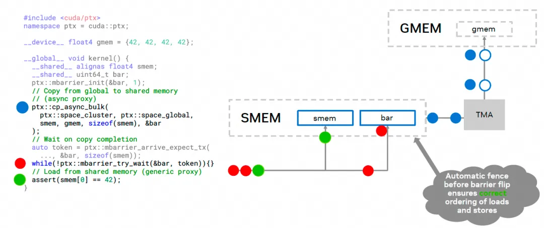 Hopper went a step further by introducing MBarrier. In software, asynchronous pipelines built around MBarrier and Warp Specialization became popular. It also introduced the Async Proxy, distinguishing different memory access paths through the General Proxy and Async Proxy. For Async Proxy operations, there is usually a memory barrier. General proxy LD/ST operations can wait for this barrier to complete, allowing TMA and other asynchronous operations to be integrated with the original SIMT memory access LD/ST instructions, ensuring memory ordering requirements.