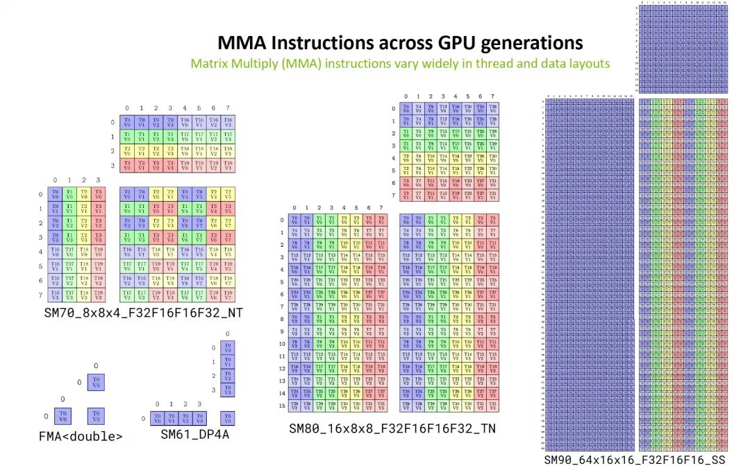 From a hardware perspective, starting from the earliest FMA instructions, to the vectorized DP4A, to the first-generation TensorCore in Volta (SM70), and then with Ampere/Hopper/Blackwell, the scale of matrix multiplication has been continuously increased, enhancing the compute-to-memory-access ratio while also supporting lower-precision data formats.