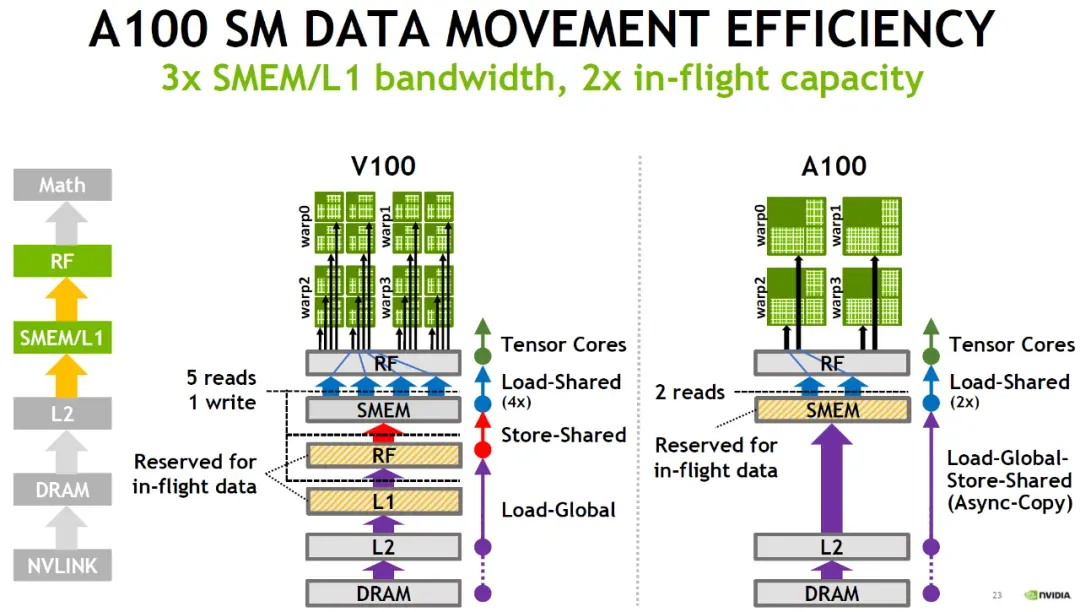 A good thing is that Nvidia provided the Cooperative Groups abstraction in software. However, TensorCore operations still needed to be executed synchronously across the entire warp. Then, starting with cp.async in Ampere, the program's data supply path effectively became asynchronous, which is what Nvidia refers to as the "Async Thread" concept.