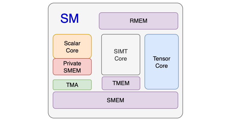 Then, I would design a small piece of private SMEM (e.g., 2KB~4KB) for it to store MBarriers. This way, the asynchronous program architecture can be more easily decoupled, without needing complex Warp Specialization handling. It would just be a TC Function, a TMA Function, and the original CUDA SIMT kernel function for the Epilogue. Then, functions related to scheduling warps and preparing TMA/TC descriptors would be placed on this scalar core. It could even be taken a step further to interact more deeply with the Warp Scheduler. In essence, it's similar to the ideas in Halide/TVM/Tae-lang, using a method that separates scheduling and algorithm.