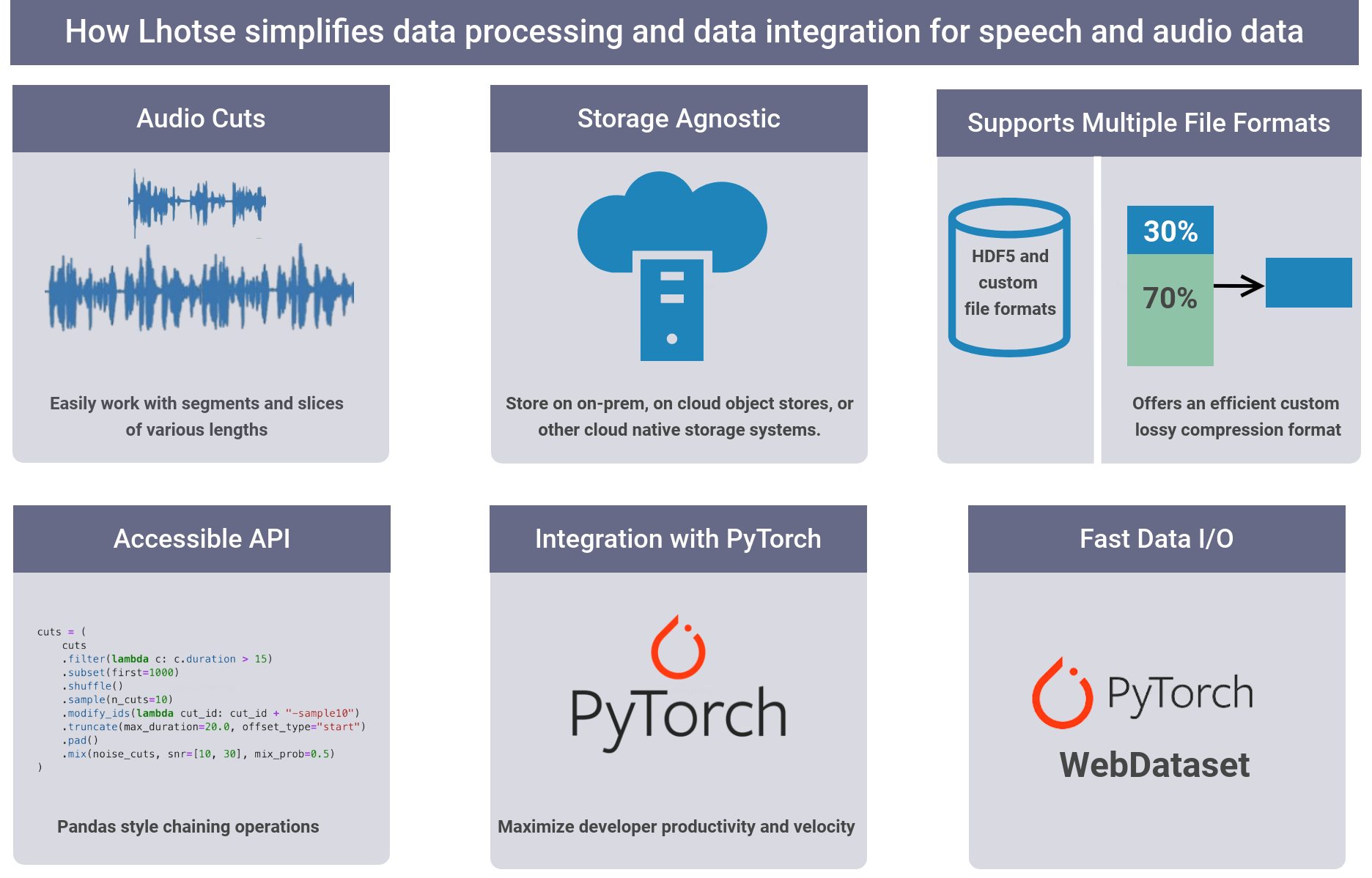 Lhotse’s primary purpose is to support machine learning workflows. Designed from the ground up to integrate seamlessly with PyTorch DataLoader API, it maximizes the developer’s modeling velocity and productivity.