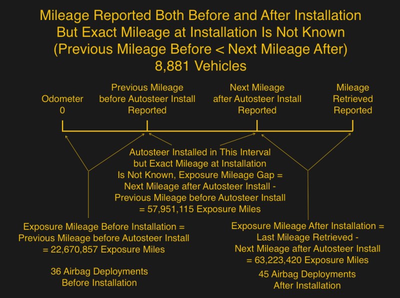 The remaining 53% of the sample consists of cars with a pre-Autosteer mileage and a post-Autosteer mileage that don’t line up. For example, maybe we know that the car didn’t have Autosteer installed at 20,000 miles on the odometer, but it did by 60,000 miles, leaving a 40,000 mile murky middle zone. The car could have had Autosteer installed at the 20,001 mile mark, or at 59,999.