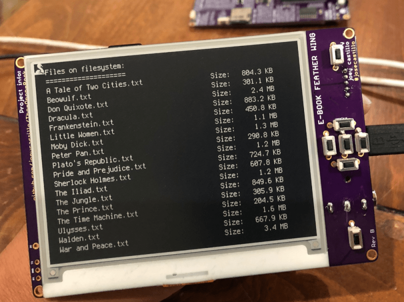 If you’re feeling a bit of déjà vu seeing this, don’t worry. The Open Book Project has taken a somewhat circuitous path to get to this first prototype, and [Joey] had previously developed and built the “eBook Feather Wing”. While they look very similar, that earlier incarnation required an Adafruit Feather to operate and was used to help refine the firmware and design concepts that would go into the final hardware.