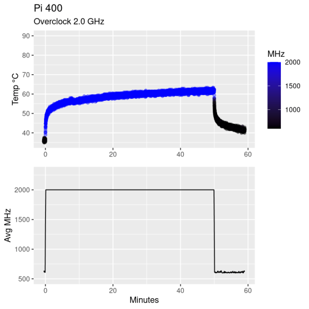 So if the Pi 400 runs just fine at stock speeds, what happens if we turn up the speed? To do so, I edited the /boot/config.txt file and set arm_freq=2000 and over_voltage=6 and rebooted. Why six? Because that’s the highest over-voltage level available without pushing the chip outside of its design envelope and voiding the warranty — you can go higher, but there’s likely little gain and you might burn things up.