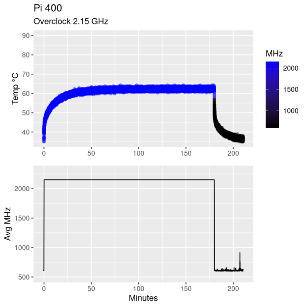 At 2.0 GHz, the Pi 400 got up above 60 °C and showed signs of continuing to warm up even after 50 minutes, but it was nowhere near throttling. So I tried 2.2 GHz, at which speed the CPU refused to boot entirely. Backing down to 2.15 GHz, it ran just fine, so I left it for three hours. It settled in at a cozy 62.5 °C, which is warm, but well within specs. My guess is that is about the limit to the performance you’ll get out of the Pi 400, but note that this is all totally stock, and it’s hammering all four cores 100% for hours on end.