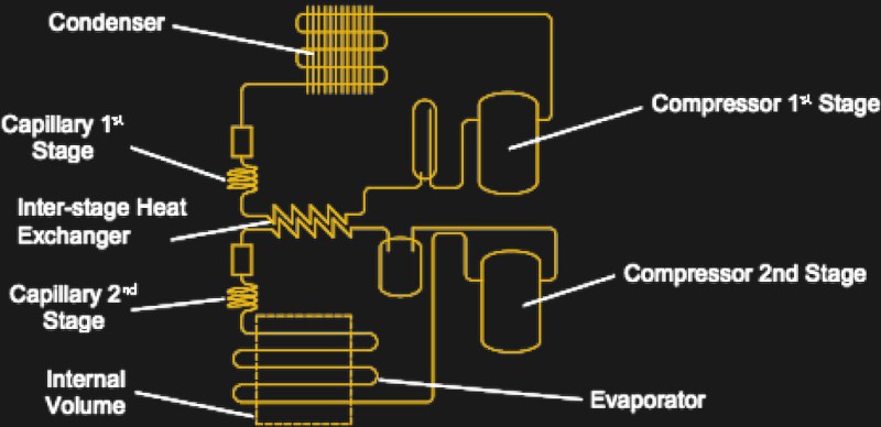 As engineers our obvious next question then is what makes a -80 °C freezer so special? We’re on firmer ground when it comes to the operation of a fridge: it’s a heat pump with a radiator, expansion valve, and condenser, through which a propellant is pumped by a compressor. The condensing propellant causes the cooling of the inside of the refrigerator, and the resulting captured energy is radiated as heat to the room by the radiator. There’s a limit to the level of temperature differential that can be created by such a heat pump, so the -80 degree freezers have two of them in series. They’re less efficient and more expensive to produce than your domestic fridge, but their manufacture is well established. We’re told it’s simply that there aren’t enough of them where they would be needed, and thus it’s interesting to think for a minute about the implications of that.
