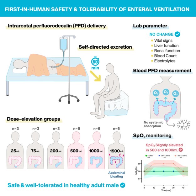 The first stage of clinical testing was focused on establishing safety profiles rather than outright testing the efficacy of rectal oxygenation. Nonetheless, even in testing with non-oxygenated perfluorodecalin, the study showed a “modest increase” in oxygen saturation in patients dosed with higher amounts of the fluid (500 mL and 1000 mL). This is a positive sign that this could be a viable route for oxygenation, but more research will be needed to verify the findings and develop the technique into something that could have actual clinical applications. That can be a particularly slow process due to the extensive safety requirements of new medical treatments, but such regulations exist for good reason.