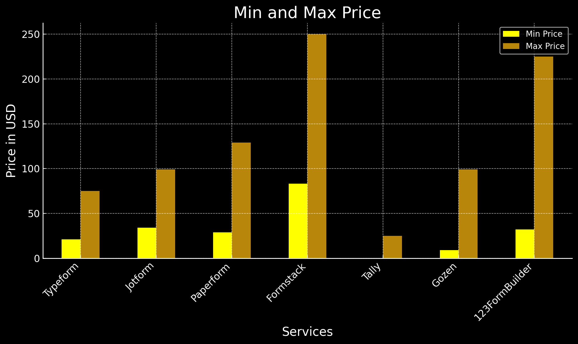 This graph illustrates the lowest and highest prices for each provider's pricing plan (excluding enterprise solutions). As shown, Formstack starts at a premium price point, which reflects the additional services they offer, such as eSigning and automation tools. On the other hand, Typeform has a lower starting price but offers limited features and volume, allowing only 100 submissions per month compared to Jotform’s more generous 1,000 submissions.