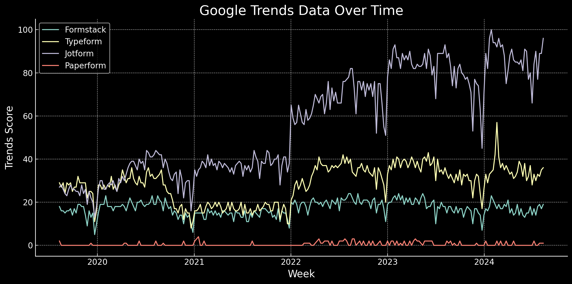 This shows the search trends for the last 5 years. As you can see, there are three dominant players within this space: Formstack, Typeform, and Jotform. These platforms have consistently maintained higher search interest compared to others. Paperform, on the other hand, acts as a challenger in this space, and its presence in the chart highlights the significant scale and market share gap between the leading players and the smaller competitors.
