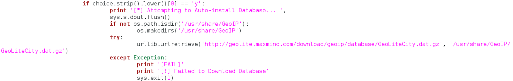 e/GeoIP exists. If it does not, we use the makedirs function to create it. This is where we will store the default database file. Now that we have a place to put the file, we can begin the download using the urlretrieve function out of urllib. This will download the file “GeoLiteCity.dat.gz” to the GeoIP directory.