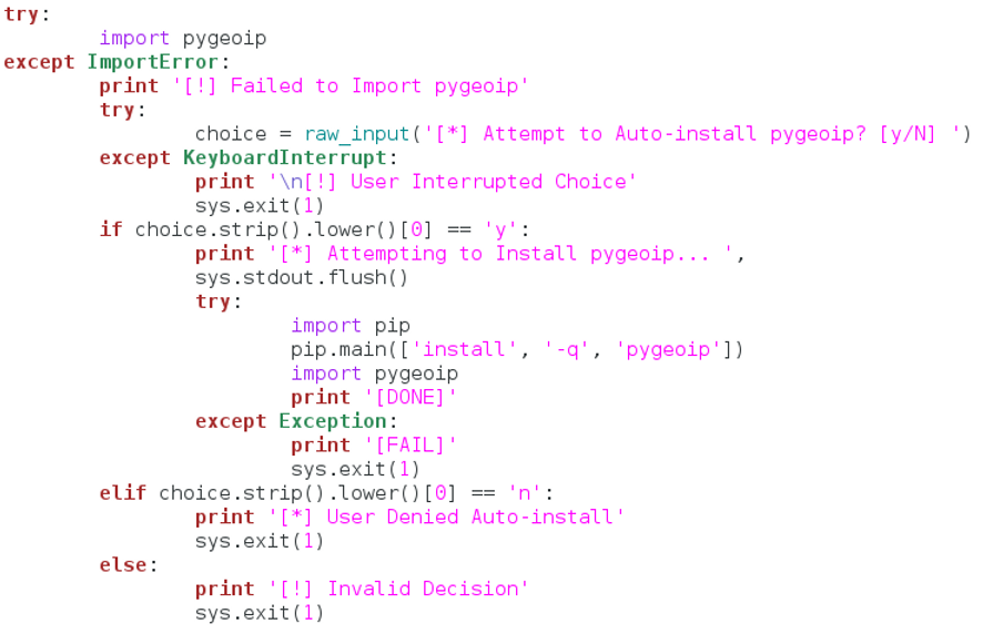 This may look like a lot, but it really isn’t. First, we try to import pygeoip, and if everything goes well nothing happens. But, if the import fails, we print that we failed to import pygeoip and then we prompt the user for auto-installation. For simplicity’s sake, we only evaluate the first letter of the user’s response. If the first letter is “y,” then we assume they said yes, obviously “n” would mean no and any other letter is an invalid option.