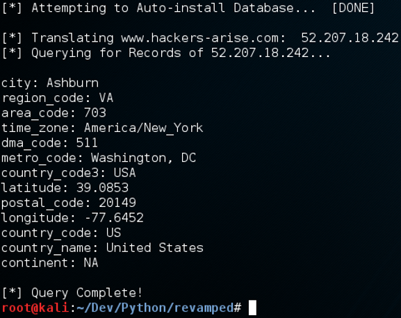 Now in order to test the automatic installation code, I’ve uninstalled pygeoip from my Kali and have deleted the database. Let’s attempt to use our script to find where Hackers-Arise is being hosted: