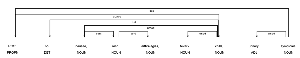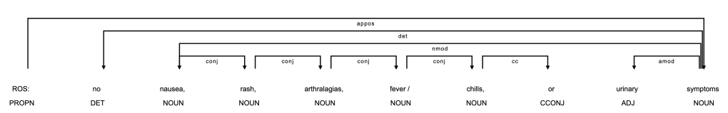 Then comes the pesky “no”. Is it referring to “nausea” or the whole list? Ideally modifiers like “no” would exist in front of each entity to resolve ambiguity, but that’s not the case so a simple rule of “does ‘no’ precede the entity” won’t work. Perhaps the linear data structure of the sentence is the issue, and using a more advanced structure based on grammar can help.