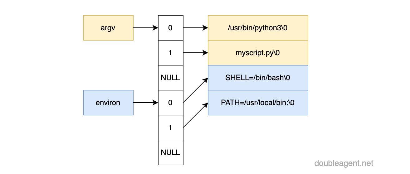 python3 myscript.pyThe command line arguments (argv) is an array of pointers to null terminated strings, with the final element marking the end with a NULL (explaining the character substitution in the above example with tr to add in a space between the filename and first argument). As illustrated: