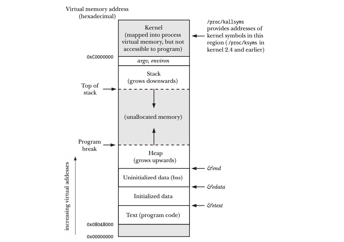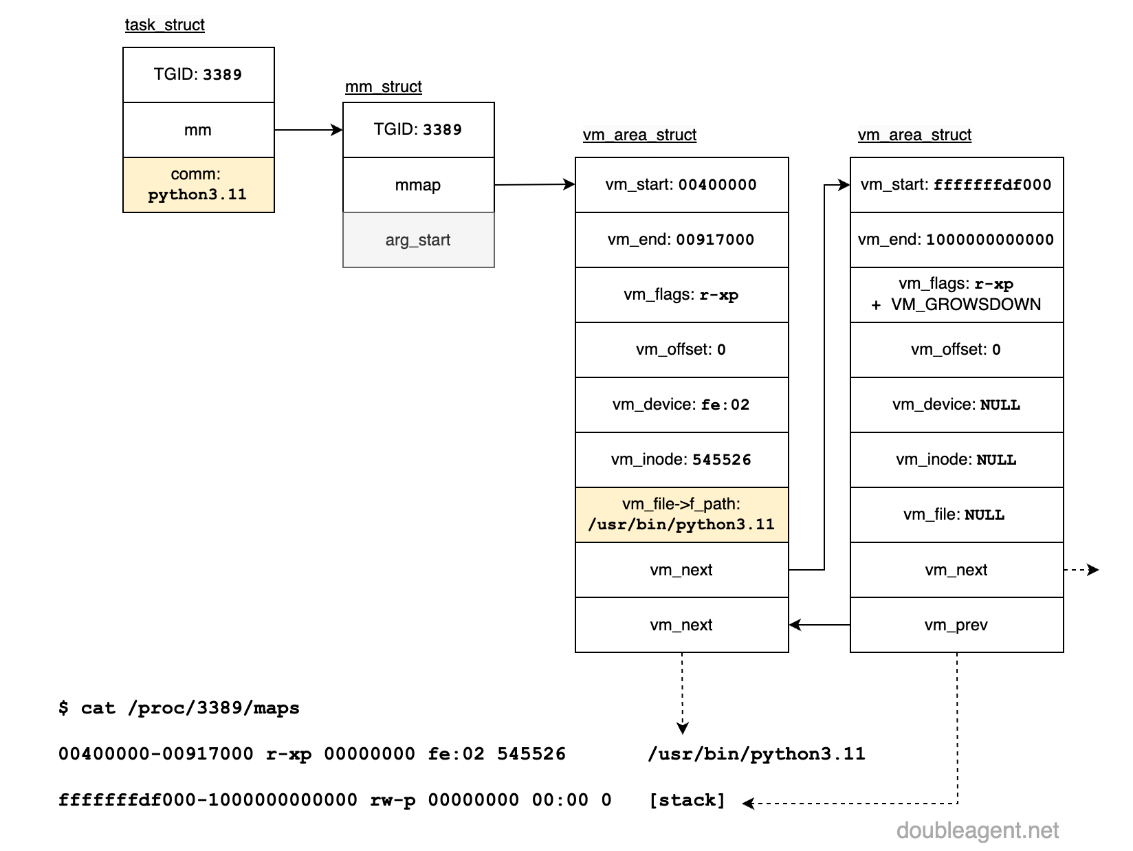 A little more onmm_struct, but we will keep it brief.mm_struct 's member mmap points to a list of virtual memory areas (VMA), which is linked list of vm_area_struct. Each instance points to the start and end addresses of regions of memory such as the stack, heap, memory mapped files etc. which is made available to userspace processes via /proc/[pid]/maps (which utilities such as lsof use). Drilling further into the python example, various members of vm_area_struct is shown for a memory mapped file, the executable binary (python3.11) and the processes stack: