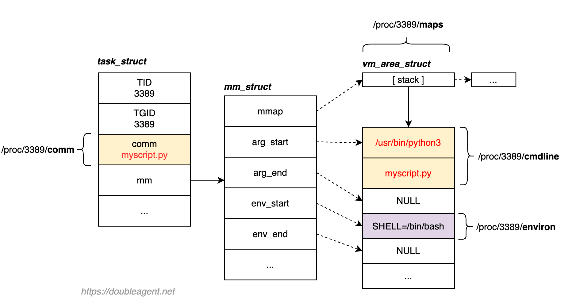 commandcmdlinecan be used for detection, although malware can modifies bothcmdlineandcomm. This can be detected by checking for a mismatch with the symbolic link/proc/[pid]/exe - It is actually possible for a running process to tamper and change