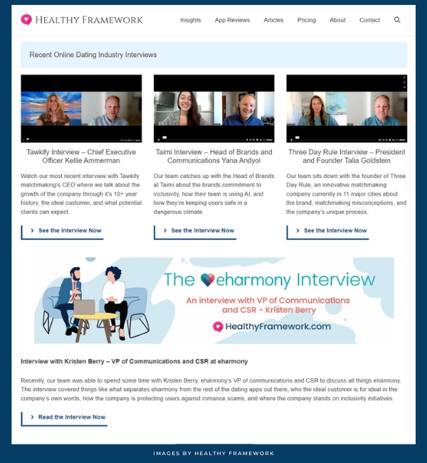 Our story is a tale as old as time last September. Like many publishers, the team at Healthy Framework is passionate about what we write about, which for us is online dating. We’ve been writing, reviewing, interviewing, and studying the industry for a little over seven years now. As cheesy as it might sound, our goal is to genuinely help people find a little joy in their search for love.