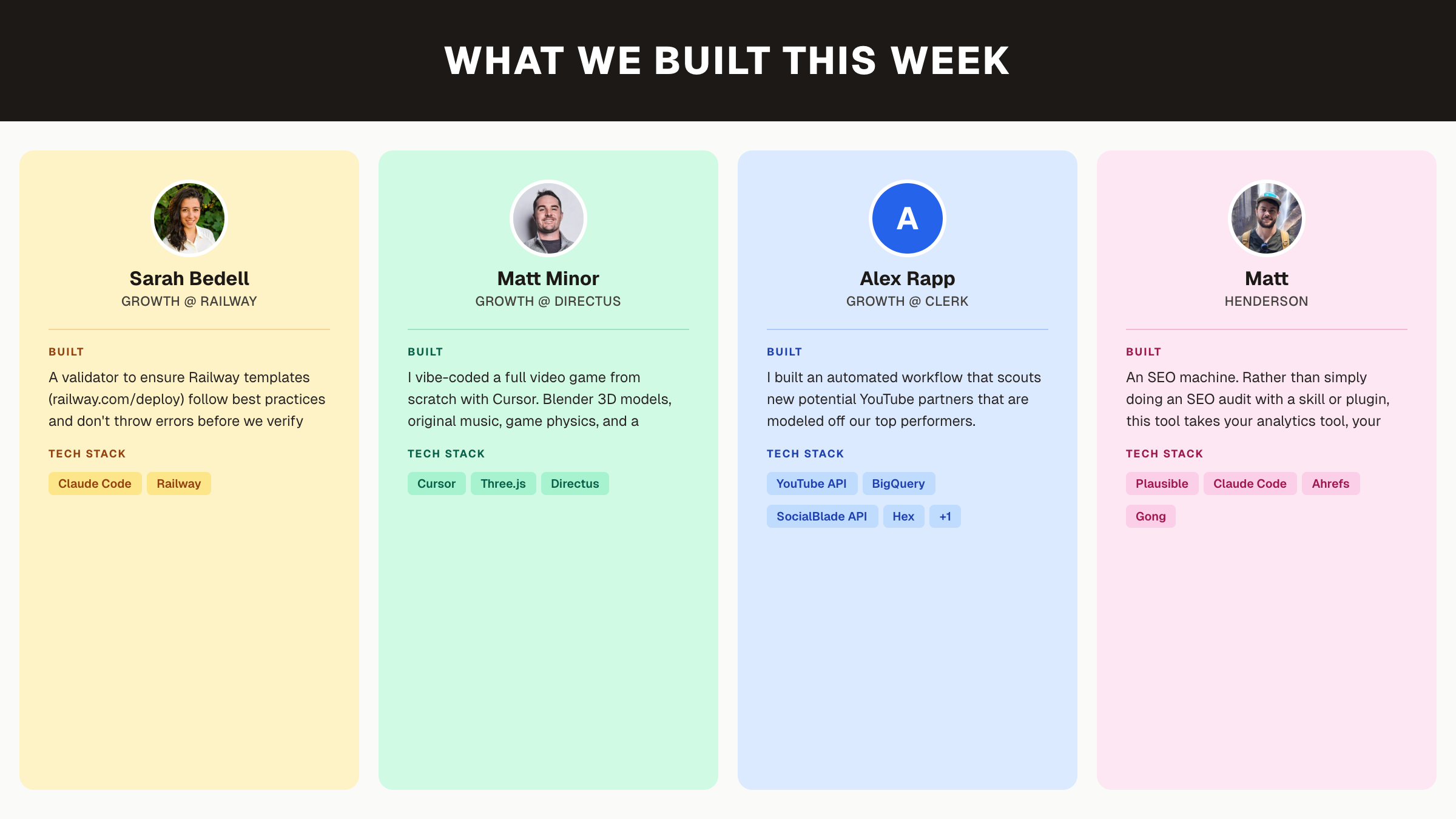 Every time I talk to someone building something real for GTM, it sparks new ideas, so I asked three of my growth friends that I deeply respect: Alex Rapp (Clerk), Matt Minor (Directus), and Sarah Bedell (Railway) to share what they’ve been building (and I threw one of my tools in too). The problem, the build, the wow moment, and how you can try it yourself.