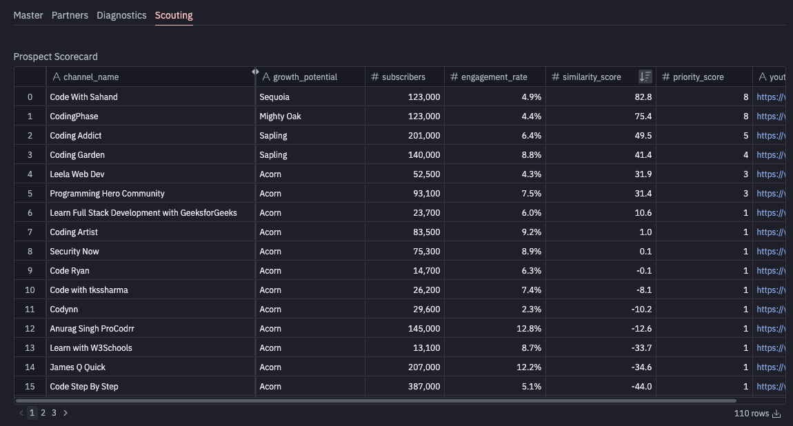 The Wow Moment: The first ‘wow’ moment was right out of the gate. The daily refreshed feed generated ~100 net-new prospective partners for us to explore. The scoring criteria I built in to assess a) growth potential, b) how similar the channel was to our existing top performing partners, and c) a priority score made it easy for us to suss out who was good, who we should monitor, and who is not ideal for our objectives. Cursor helped write the majority of the underlying SQL & Python queries, tapping directly into our existing YouTube partner performance database, ensuring that the scoring system was fluid & would not recommend partners we’re already engaged with - including new ones we cherry pick from the scouting list.