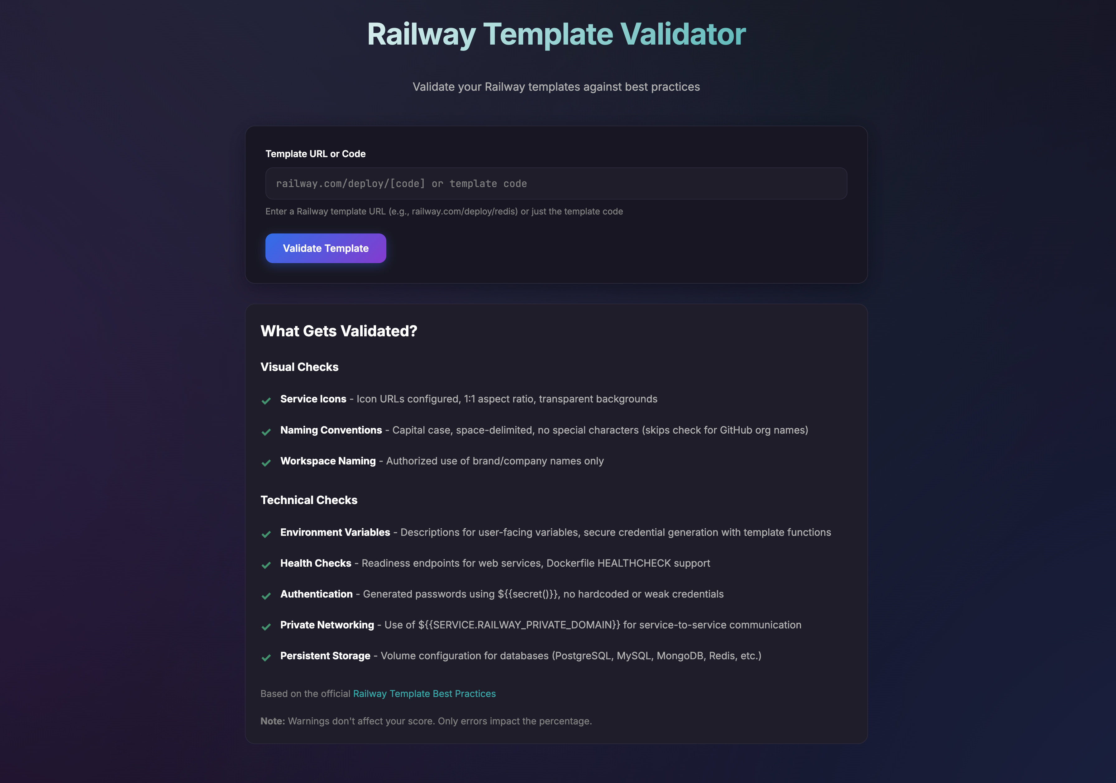 Instead, I vibe-coded a tool that uses the Railway Agent Skill to test a template for best practices, as listed out in our docs. The tool was built purely with Claude Code and deployed in Railway (via Claude Code). It was backtested with several known-good and known-bad quality templates to ensure accuracy.