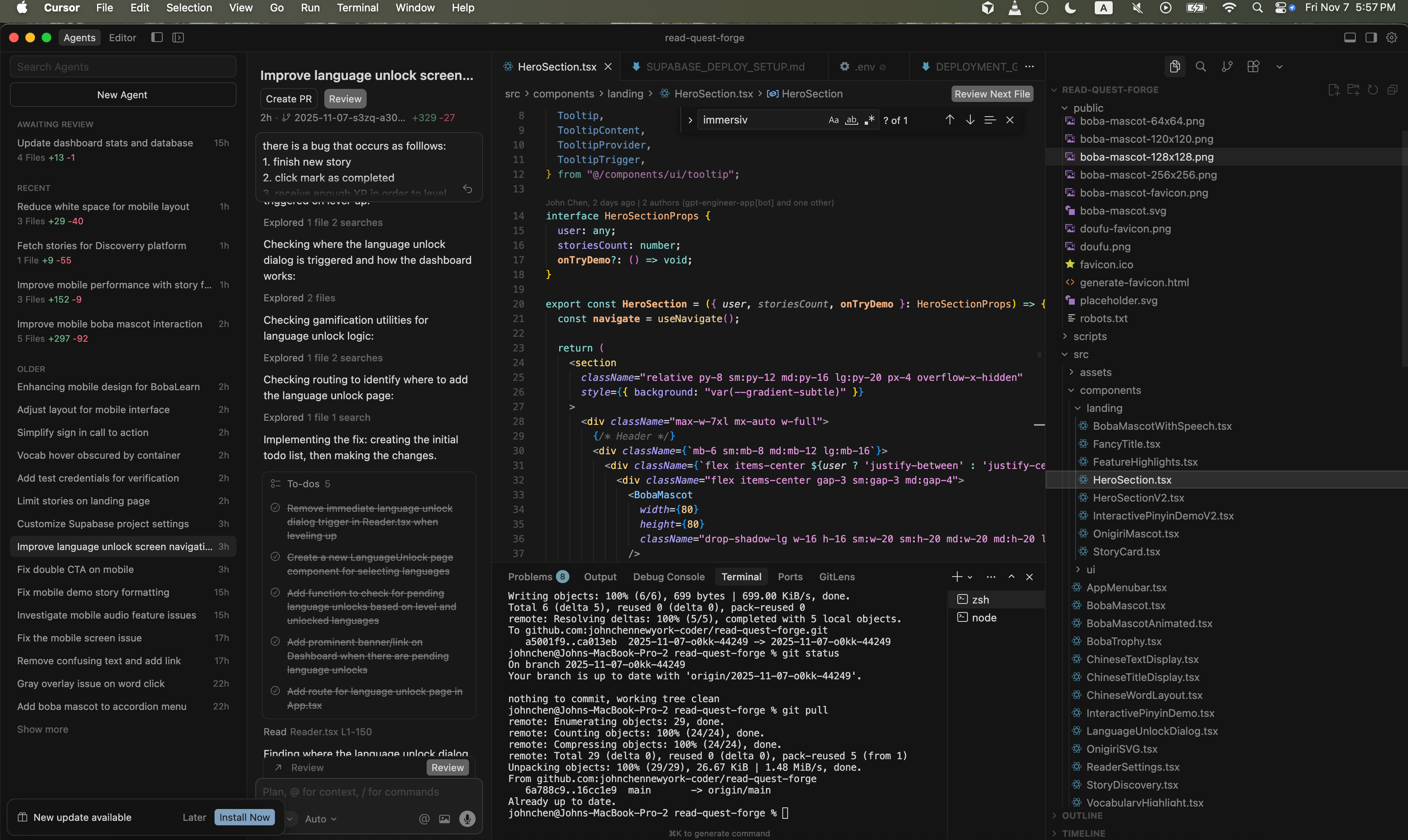 Cursor is amazing. Features version control, PRs, picture chat, and an extremely generous (but time limited) free trial. I built most of BobaLearn just within the 7 day free trial. Oh and also parallel agent processing (multiple agents editing the code base at once). Recommendation: pick cursor, with caveat