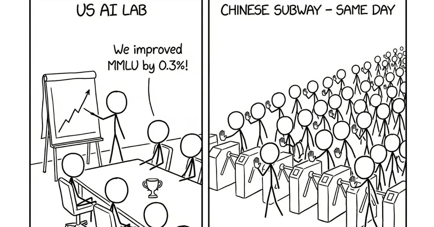 And so the technology trajectories continue to diverge. The United States optimizes for benchmark performance. China, in contrast, optimizes for practical value at scale.