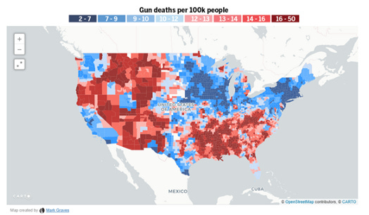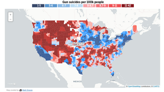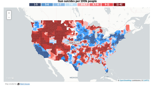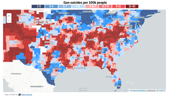The first map shows big swaths of red in the generally “red state” areas of the country, and most of the social media dialog I’ve tracked on these maps boils down to red-state political bashing and gun bashing. But there are very important things to be gleaned from the following two maps, which dis-aggregate the deaths by homicide and suicide.