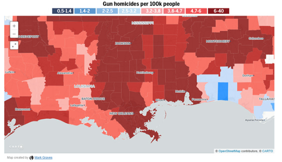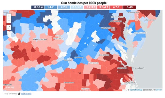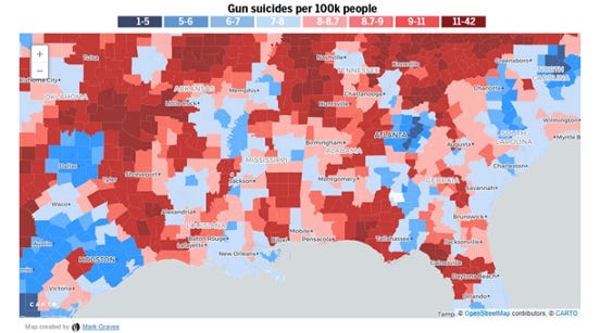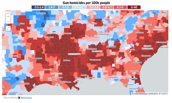 How on earth is any of this possible? It certainly doesn’t fit the “it’s the guns” narrative. If it were “the guns,” then these hot spots would mostly overlap. There are a few overlaps (sorry Shreveport, sorry Coal Country) but most of the country exhibits the exact opposite behavior than we would expect from the “it’s the guns” hypothesis.