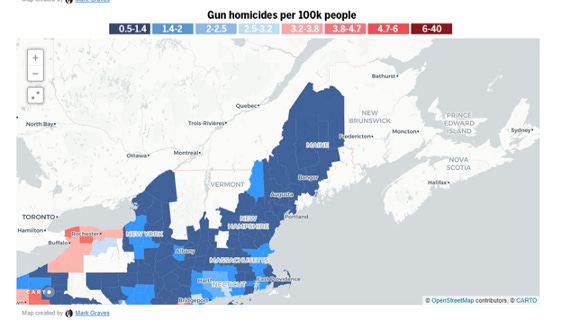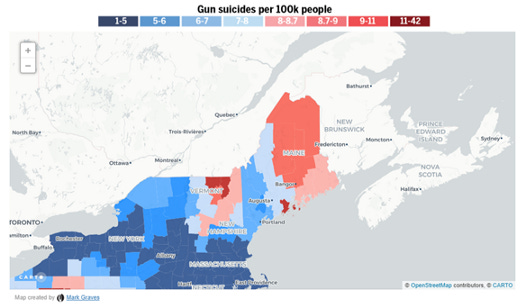 Gun homicide rates are generally homogeneously low across New England, but gun suicide rates spike in Maine. And gun homicide rates crater in northern Vermont and southeastern Maine, where suicide rates are high.