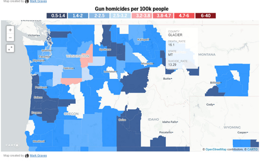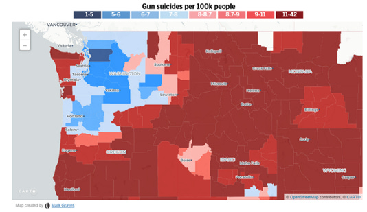 Washington State has generally low homicide rates and suicide rates, outside of a stretch along the Pacific coast. But anyone who’s driven through Washington State knows that the character of the land, and the people, shifts around Spokane and starts to align more with the sorts of folks you meet in Idaho, Montana, and Wyoming. Here gun homicides start to drop and approach zero, while suicides jump into the highest per-capita category. The exact same effects can be seen when you finish your drive eastward and land in Minnesota and the Great Lakes states: