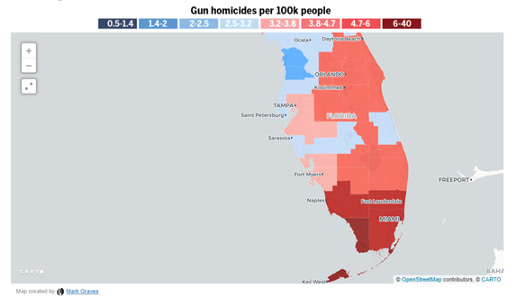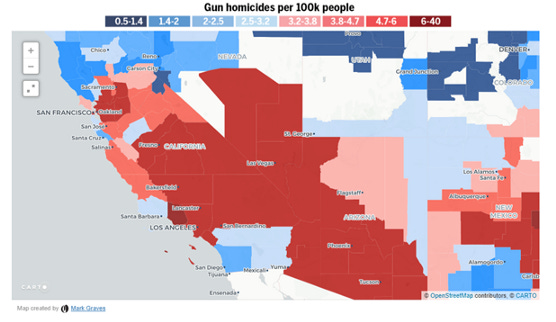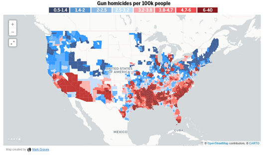 Gun suicides account for about two thirds of gun deaths, so this map is going to look generally like the first one. No huge surprises here. But there are many regions red in the “deaths” map that flip blue in the “suicide” map, and the reason why is clear when you look at the “homicide” map, here:
