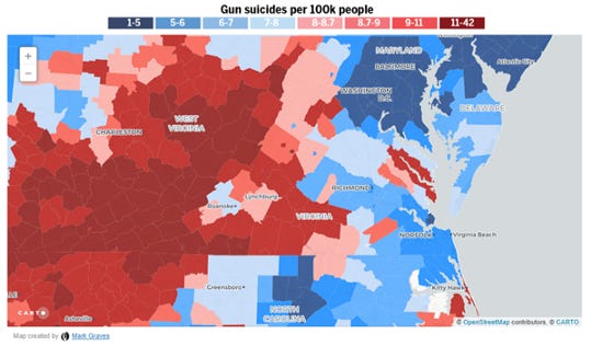 Gun homicides in DC and Baltimore are high, suicides are low. Drive west and it flips. Drive south and it flips too, at least until you get to Richmond, after which time it flips back. The stretch from Richmond to Norfolk and Virginia Beach is high homicide, low suicide.