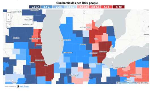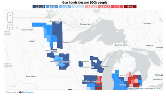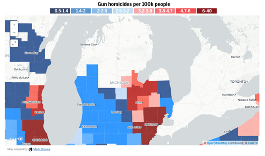 There is basically a horizontal map line at 44 degrees latitude that bisects the peninsula, north of which we have zero gun homicide and lots of gun suicide, and below which we have.. ..Bay City, Flint, Detroit, etc. It’s not the guns here.
