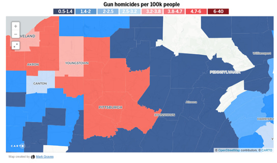 Rates in the maps above are red/blue, rates in this bar chart are yellow. Black male firearm homicide victimization rates are 35 times that of white women. They’re the ones getting shot. How does that match our maps above? Here’s a rust belt comparison for homicide: