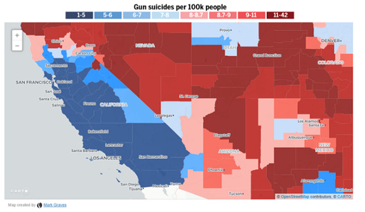 Gun suicide is a California problem north of Sacramento. Gun homicide is a problem south of it. There’s basically a geographic boundary that runs through Reno, Sacramento, and San Francisco where suicides are a problem to the north, and homicides are a problem to the south. I hear it’s nice in San Diego, and these maps confirm it.